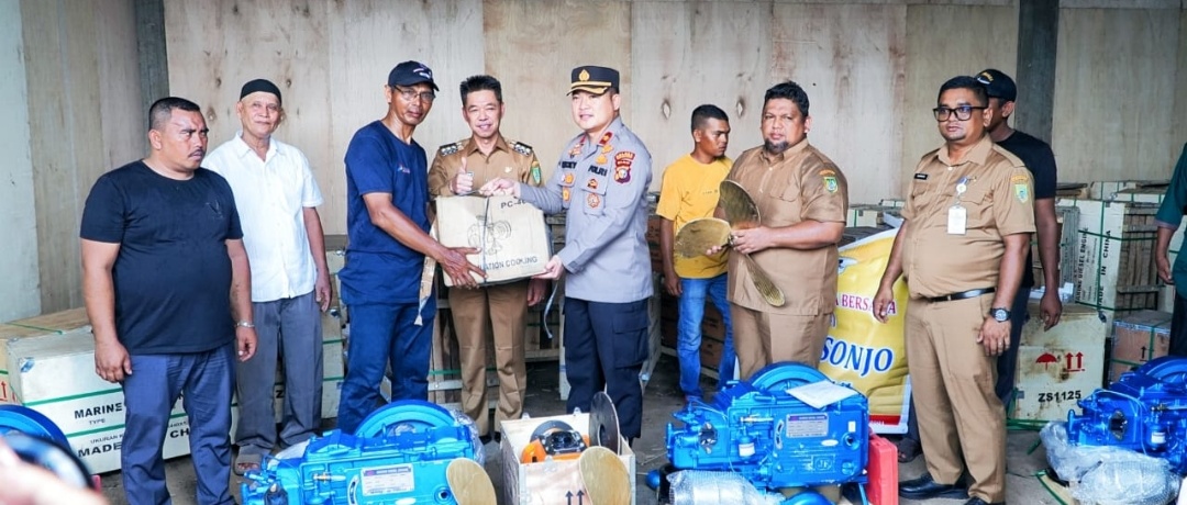ROHIL- Bupati Rokan Hilir Afrizal Sintong bersama Wakapolres Rohil Kompol Ricky Michael Mandey secara simbolis menyerahkan bantuan mesin boat sebanyak 80 buah mesin kepada kelompok nelayan yang ada di Kecamatan Bangko dan Palika, Selasa (19/9/2023) di pelabuhan ansui Bagansiapiapi.