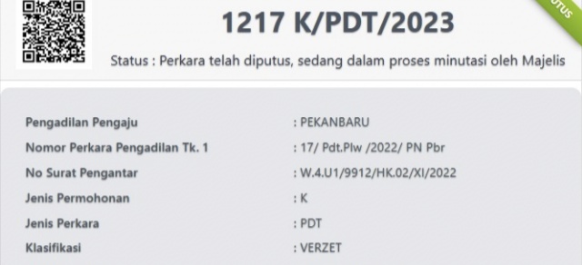 Dimana mahkamah agung menyatakan bahwa, laporan polisi yang dilaporan komisaris ke kapolda Riau itu adalah masuk ke ranah perdata,” terang Muhammad Amin melalui rilis yang diterima media ini, Kamis (3/8/2023).