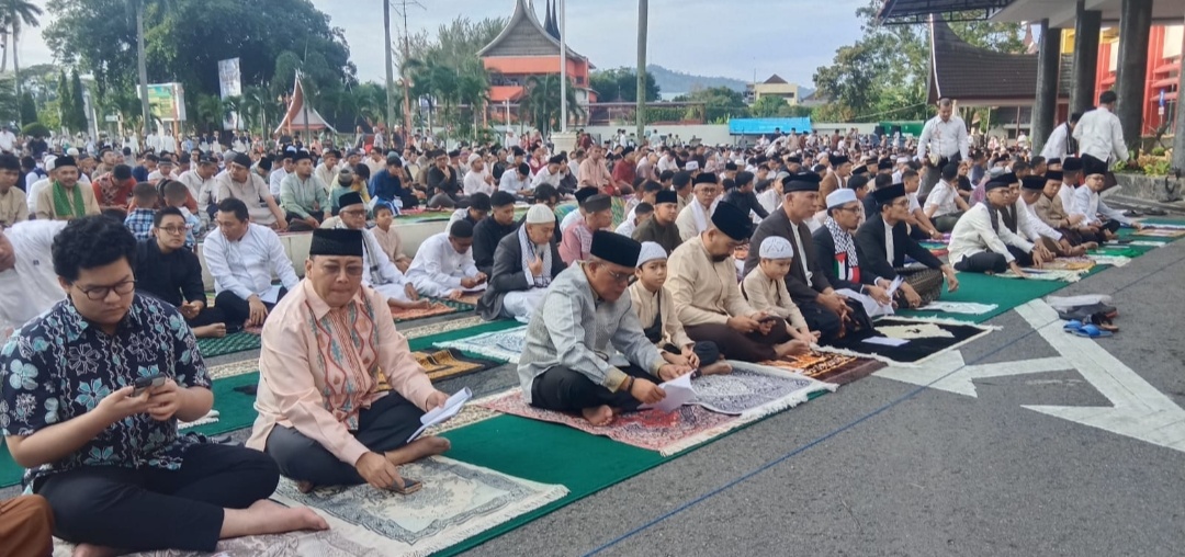 PADANG- Jama’ah Sholat idul Fitri 1445 H di halaman kantor Gubernur Sumatera Barat membludak hingga meluber ke jalan dan tempat parkir.