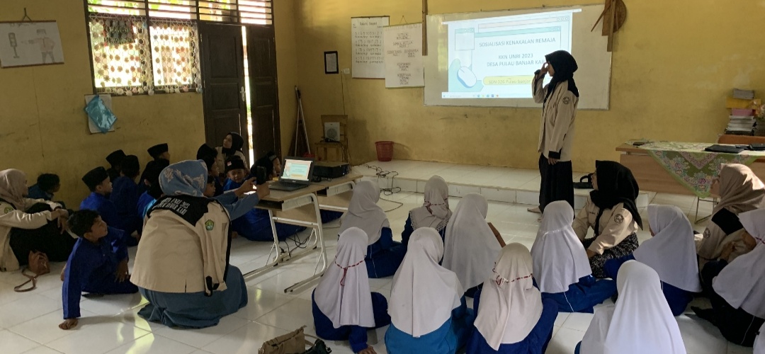 BANJAR KARI- Mahasiswa Universitas Riau (UNRI) melakukan sosialisasi kenakalan remaja di SD dan MTS yang berada di desa pulau banjar kari serta kegiatan yang tergabung dalam sasar Usaha Mikro Kecil Menengah (UMKM) di Desa Pulau Banjar kari dalam rangka melaksanakan kegiatan Kuliah Kerja Nyata (KKN).